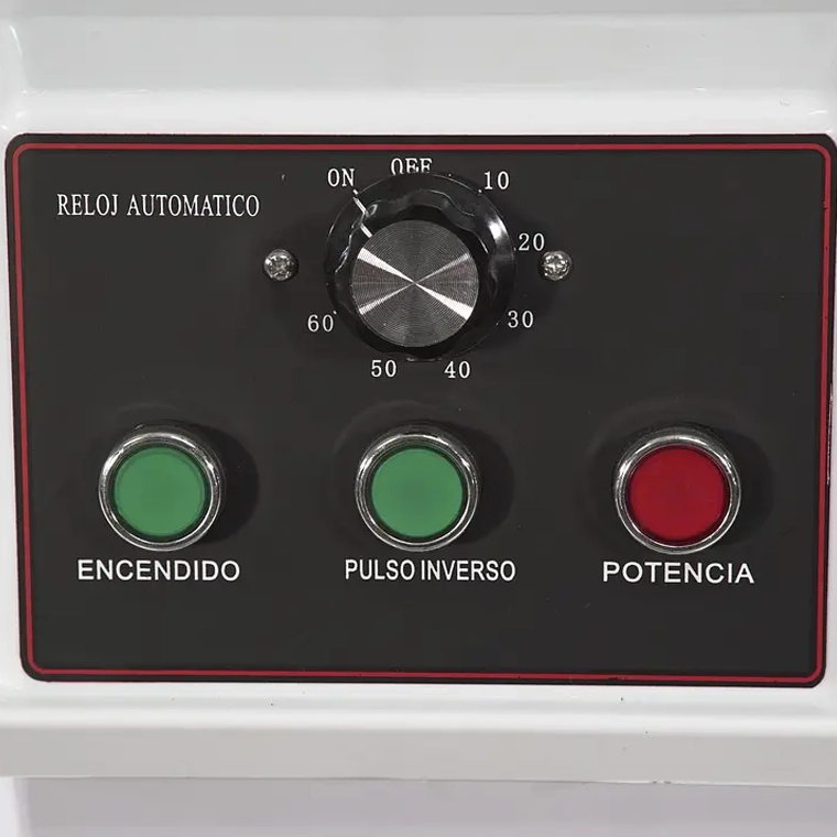 Equipada con motor de alta potencia y un confiable sistema mixto de transmisión por correa y cadena, esta amasadora entrega un funcionamiento robusto y eficiente para jornadas de trabajo intensivas. Además, incorpora botón de reversa, facilitando la extracción de la masa y mejorando la operación diaria en procesos productivos que requieren agilidad y control.