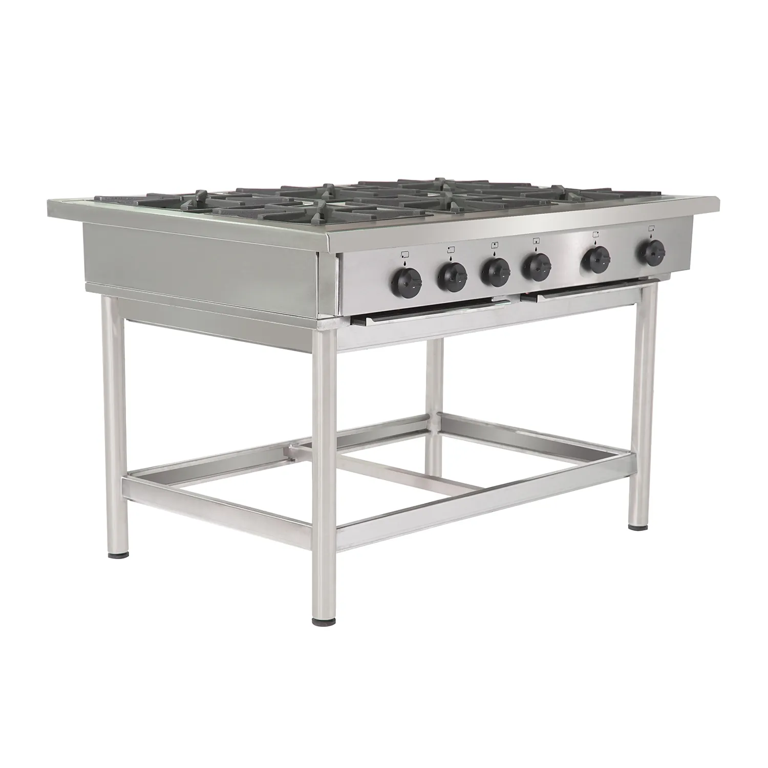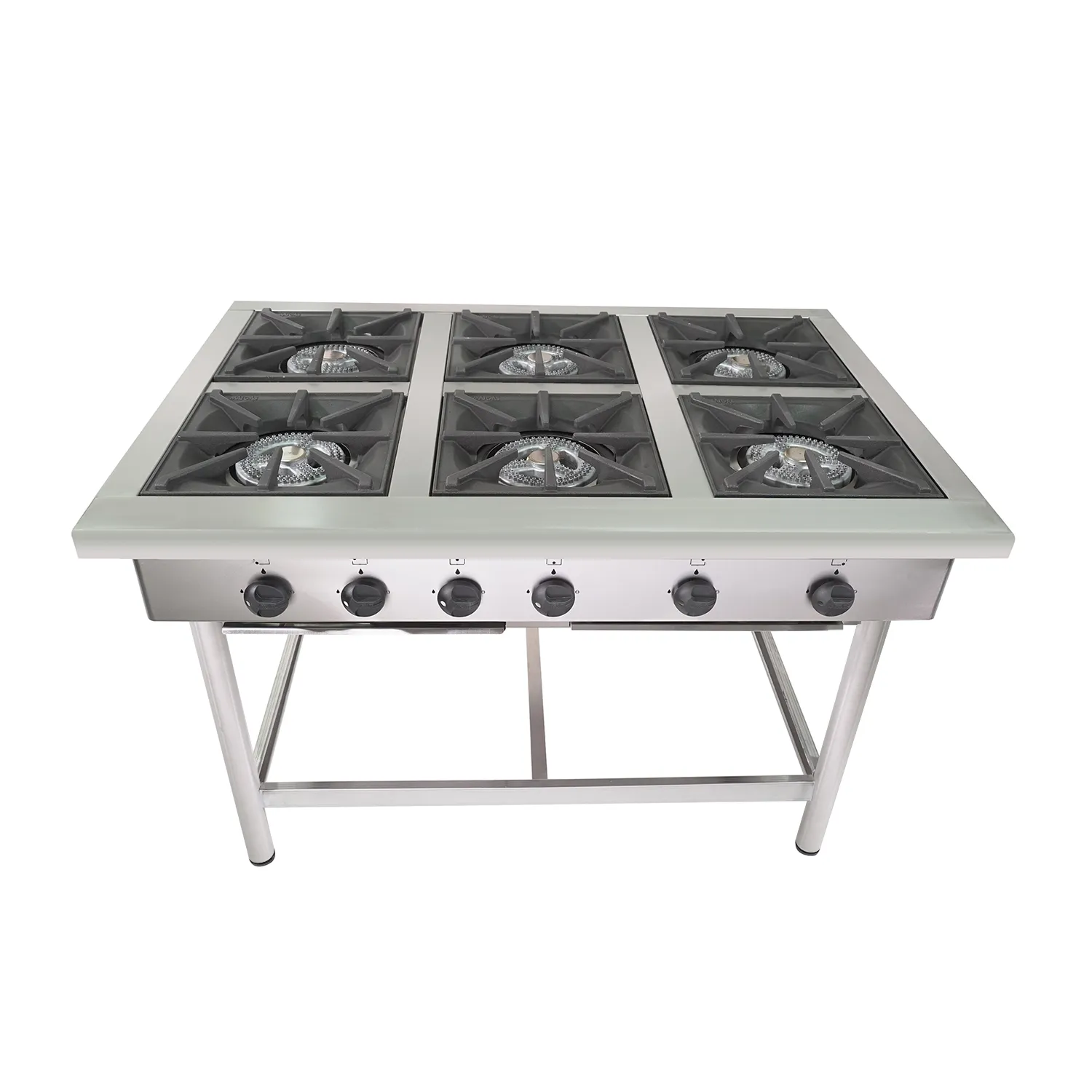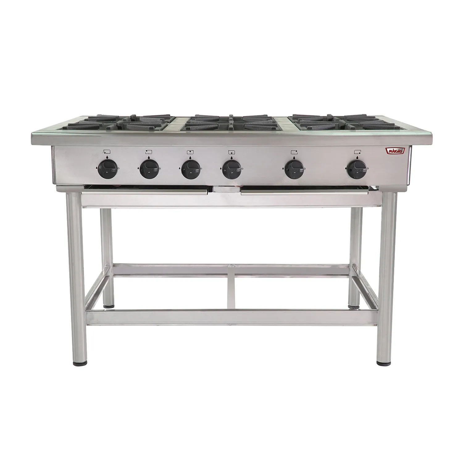 Su construcción íntegramente en acero inoxidable le entrega resistencia estructural, mejor comportamiento frente al uso diario y una limpieza más práctica en ambientes gastronómicos exigentes. Incorpora parrillas de fierro fundido tratadas para altas temperaturas, diseñadas para soportar trabajo continuo y recipientes pesados sin comprometer estabilidad. Además, utiliza quemadores industriales de aluminio de 180 mm, comandados por llaves de 3 posiciones con dispositivo de seguridad, una configuración orientada a entregar control, rendimiento y operación segura en cocina profesional. Los platos de rebalse en acero inoxidable y las patas tubulares de acero inoxidable completan un diseño robusto y funcional.