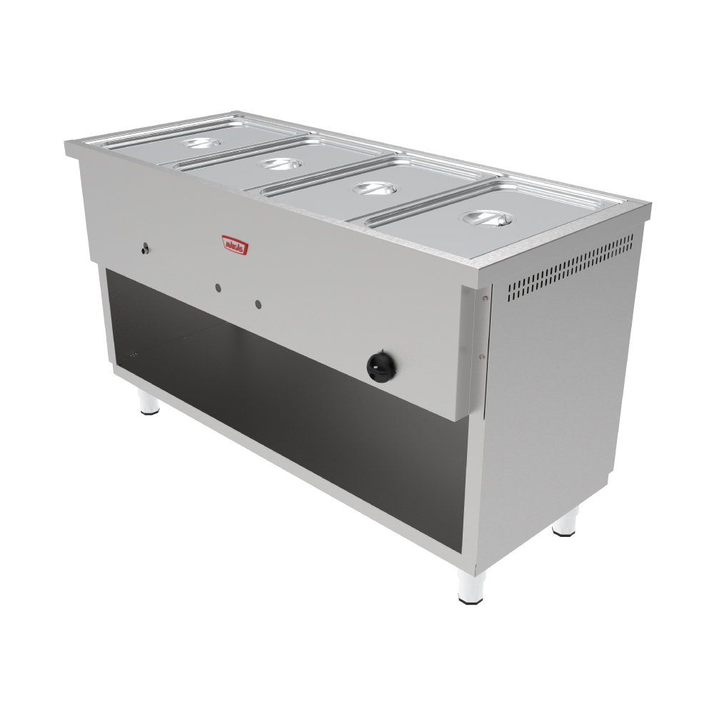 Su estructura está fabricada en acero inoxidable, material que favorece la resistencia al uso intensivo, la higiene y la facilidad de limpieza en entornos gastronómicos profesionales. El fabricante indica además que incorpora 4 depósitos GN 1/1 de 20 litros cada uno y un quemador tubular de fierro, configuración pensada para generar calor uniforme mediante vapor y mantener los alimentos en condiciones adecuadas de servicio sin resecarlos excesivamente.