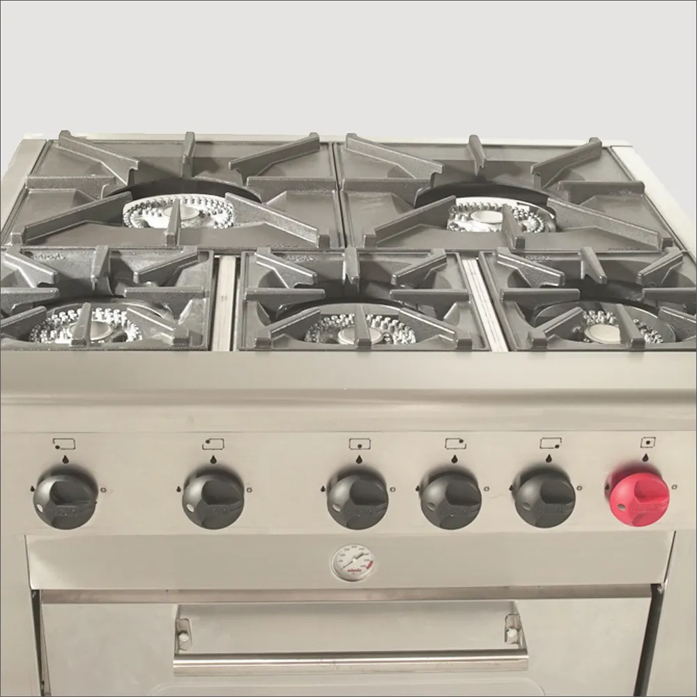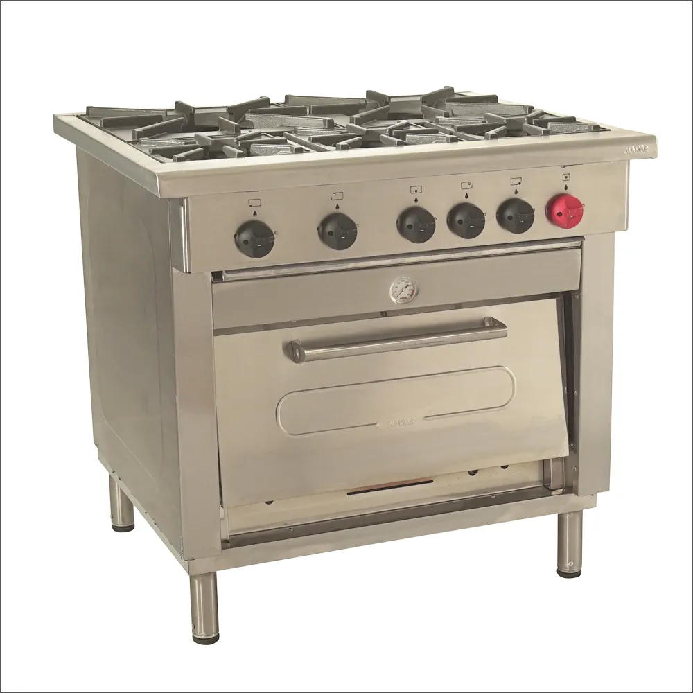 Cocina industrial compacta y robusta, fabricada 100% en acero inoxidable. Equipada con 5 quemadores de alto rendimiento y una cámara de horno con bandejas enlozadas, ofrece versatilidad y comodidad para producción gastronómica constante. Su diseño facilita higiene, manipulación segura y cocción estable. Ideal para restaurantes, panaderías, hoteles, casinos y negocios de comida en general.