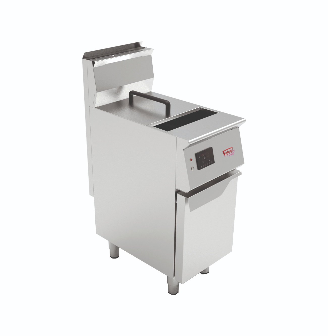 Su estructura está fabricada íntegramente en acero inoxidable AISI 304, un material ampliamente valorado en equipamiento gastronómico por su resistencia a la corrosión, su higiene superficial y su durabilidad en ambientes de trabajo intensivo. La freidora incorpora una puerta abatible con cierre magnético, luz piloto, botón de reset y un moderno display gráfico que permite regular la temperatura de forma más precisa y automática durante el proceso de cocción. Estas características favorecen una operación más controlada, estable y eficiente en servicios de alta demanda.